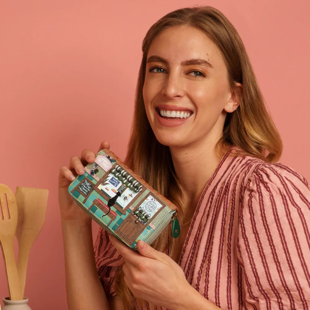 For foodies and fashionistas alike, the Vendula Pie Shop Medium Ziparound Wallet is a dream! Spacious enough to carry all your cash, cards, and receipts, it keeps everything secure with a full ziparound closure. With its adorable artwork—including a lattice-textured roof and colourful appliqué—this wallet pairs perfectly with your Vendula Pie Shop bag. Carry it through to spring—you’ll be the envy of all your friends!